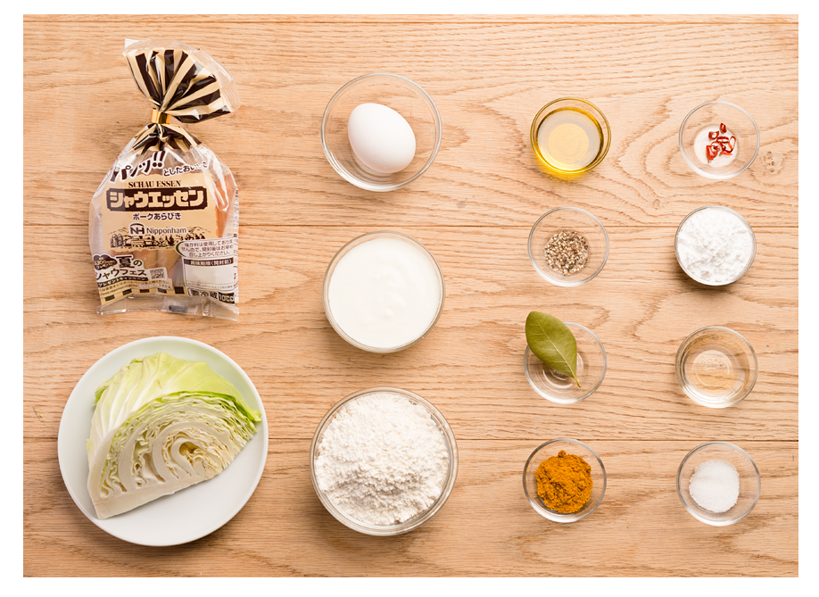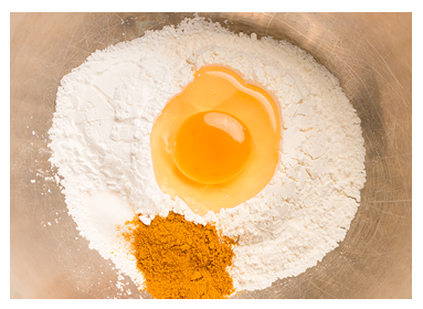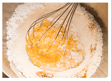 小麦粉、片栗粉、カレー粉、塩をボールに入れ、中心を凹ませ、卵を入れ、泡立器で中心から徐々に周りの粉を崩しながら混ぜ合わせる。