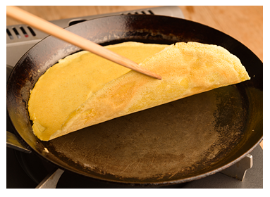 中火で熱したフライパンをぬれぶきんの上に置いて、お玉1杯ほどの生地を流し広げ、表面が乾き縁がパリパリするまで焼き、裏返して30秒ほど焼いてクレープ生地の完成。