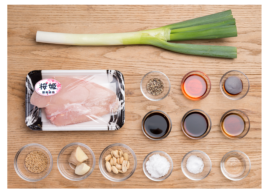 桜姫® むね肉に、塩、こしょう、しょうがをおろしたものを深めの耐熱皿に入れ、5cm幅にカットした長ネギの青い部分をのせ、酒、ごま油を回しかける。