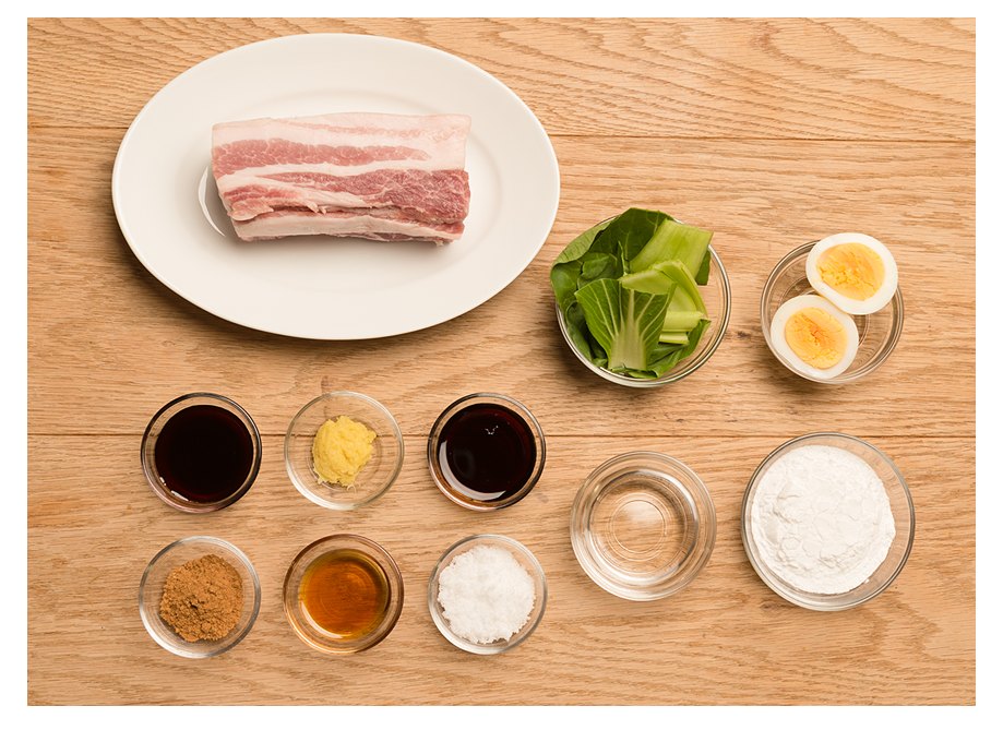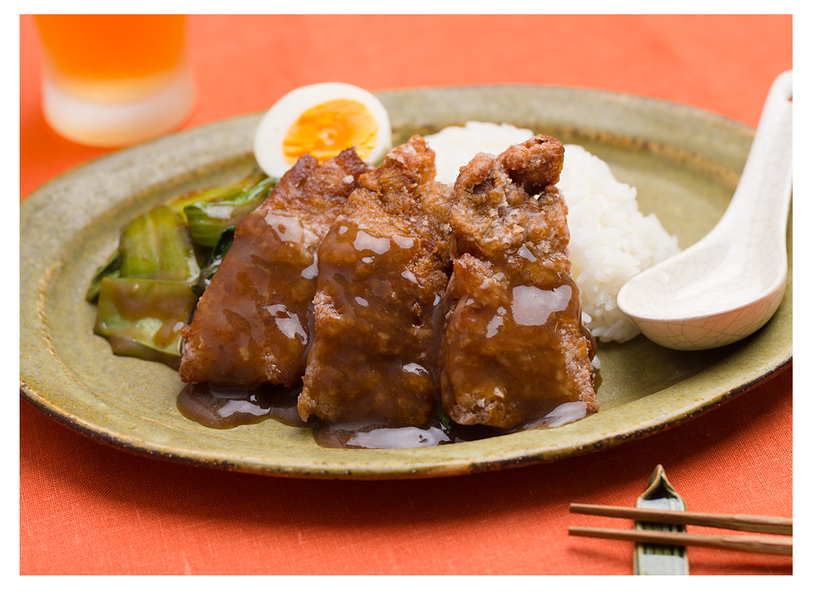 お皿に温かいご飯、半分にカットしたゆで卵、豚肉をのせ(3)をかけて完成。豚バラ肉の油がジューシーです。台湾では屋台で食べられる簡単な調理飯です!ビールと一緒に召し上がれ。