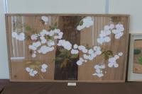こちらはシンポジウムで展示されていた板の木目を生かした絵画。千葉県酒々井町在住の画家・ 岸浪方子さんの作品