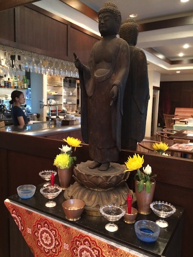 木のぬくもりが感じられる、寺感というよりカフェ感が強いこの寺カフェなんですが、メニューは「南無南無カレー」や精進料理など、寺にちなんだものが目立ちます。(ところでこの「南無」って、インド語の挨拶「ナマステ」の「ナマ」と同じ言葉で、「あなたを受け入れます」って意味らしいですよ)川崎市にある信行寺が、お寺や仏教を身近に感じてもらおうと代官山に開いたカフェで、オープンテラスの明るいカフェには本物の仏像が置かれていて、触ってもOKなんだそうです。