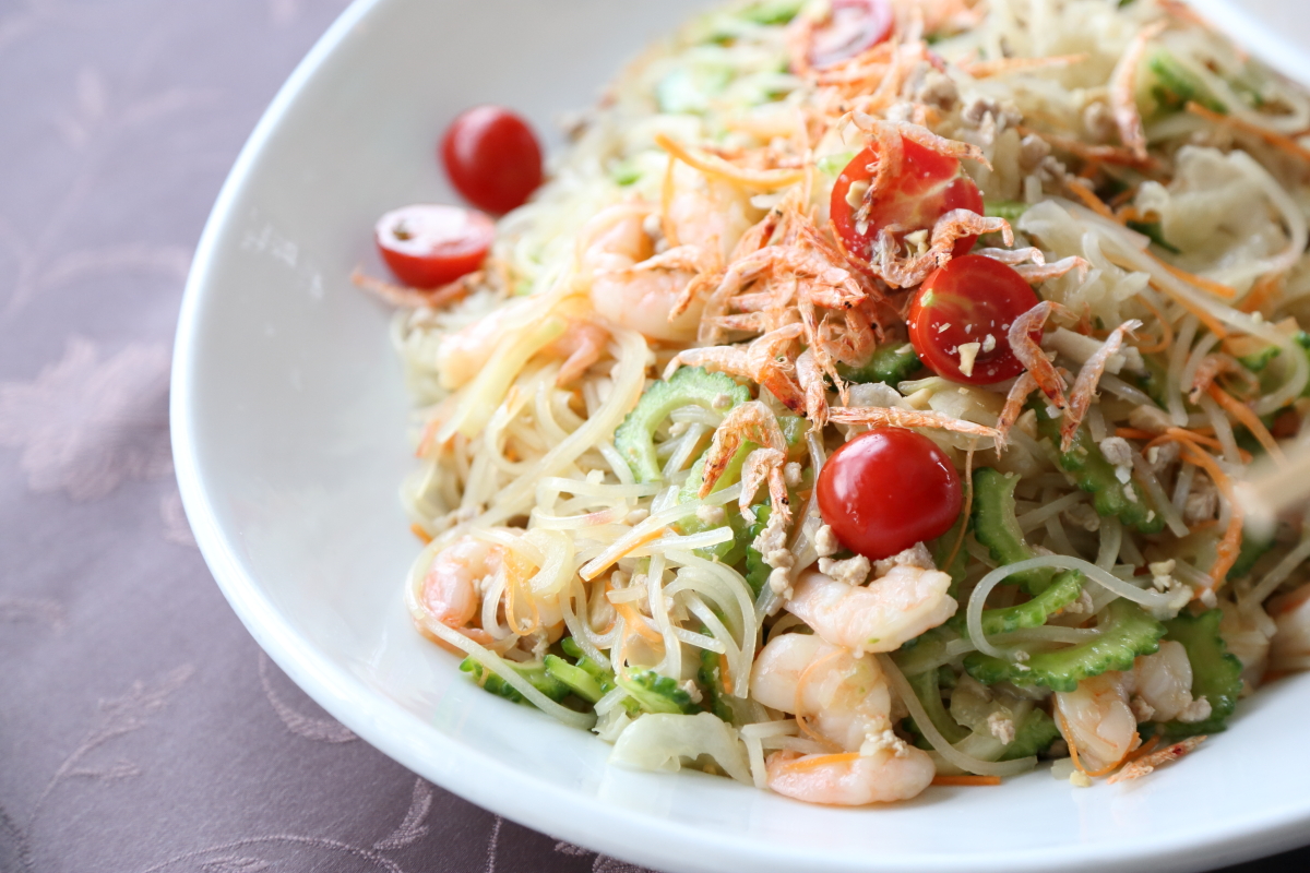 「ゴーヤーときのこ 海老、豚肉 具だくさんピリ辛春雨サラダ」に
