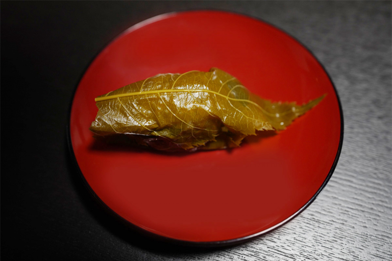 さきほど、お寺の境内で買ってきた桜葉もち。