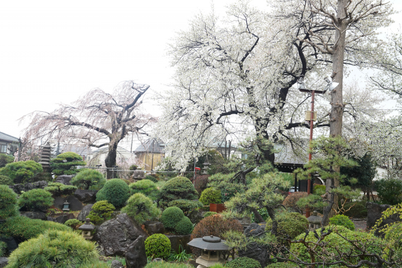 増田:今ですと、この桜ですね。しだれ桜とこちらの白い桜・・・大島桜というんですが、あと、本堂の脇にピンク色のお花の八重桜があります。