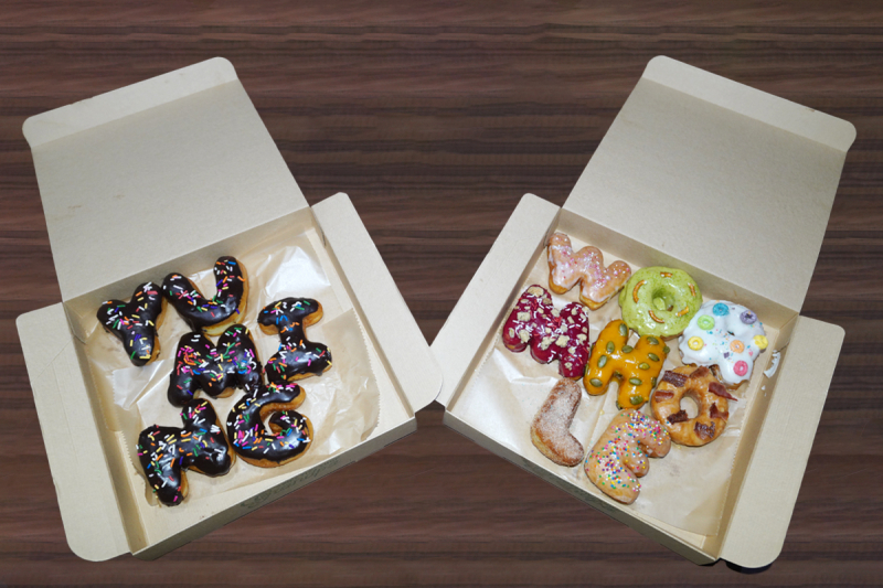 オーダーでアルファベットのドーナツを作ってくれて、アルバムにちなんで「WORMHOLE YUMING」という2箱。「W」からはじまって、それからもう1箱は「Y」からはじまる。